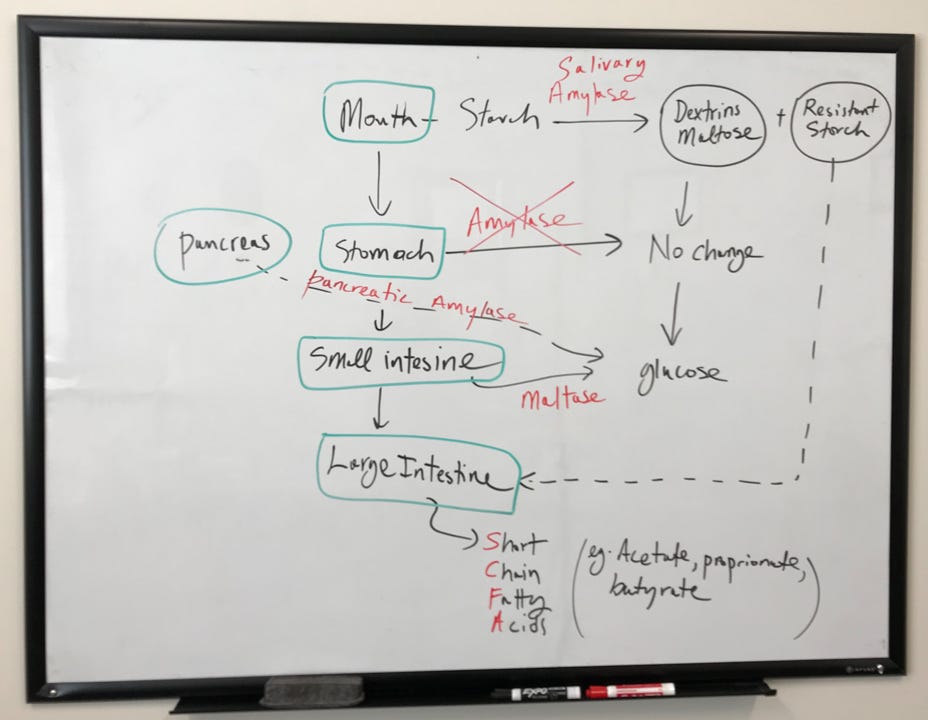 Some starch will reach the large intestine unchanged. These are known as resistant starch. They function as dietary fiber since they are fermented by bacteria to produce short chain fatty acids (SCFA) including acetate, propionate and butyrate. SCFA have been associated with improved gut health.